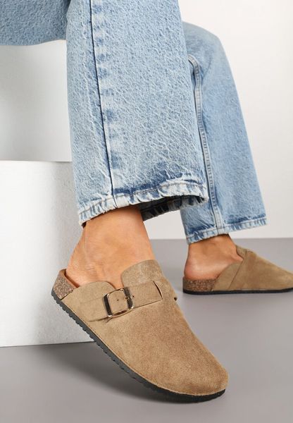 Ciemnobeżowe Klapki Ozdobione Klamrą na Pasku Zelevelis