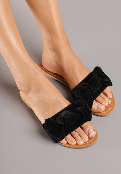 Czarne Klapki na Płaskiej Podeszwie z Kokardką Zovia