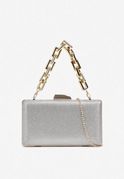 Srebrna Torebka Kopertówka z Łańcuszkiem Zdobiona Metaliczną Aplikacją Idalinna
