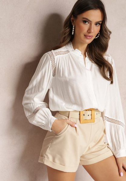 Biała Koszula z Wiskozy ze Stójką i Koronkowymi Wstawkami przy Ramionach Meami