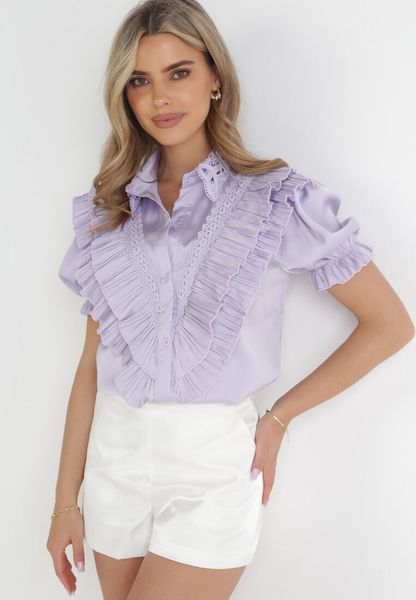 Koronkowa koszula Marwa z krótkimi rękawami. Zapinana na guziki na całej długości. Z przodu plisowane falbanki i koronkowe wstawki. Wyróżnia się koronkowym kołnierzykiem. Świetnie sprawdzi się w stylizacjach na randkę czy do pracy.