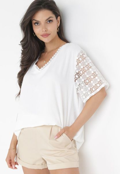 Biała Wiskozowa Bluzka z Koronką przy Dekolcie Adely