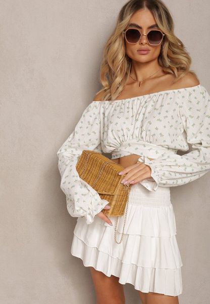 Biało-Miętowa Bluzka w Drobne Kwiatki Wiązana Pod Biustem Wokół Talii Docamona