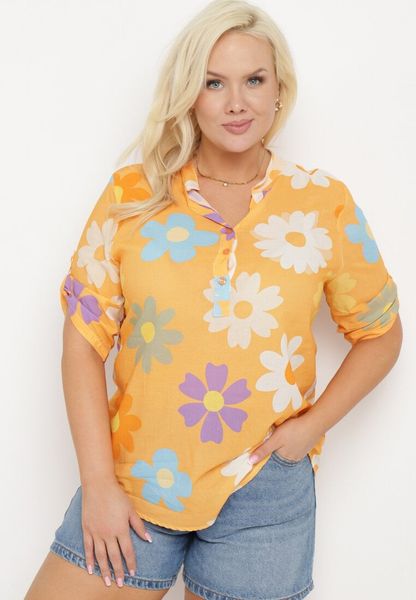 Pomarańczowa Wiskozowa Koszula Zapinana na Guziki z Rękawem Długości 3/4 i Wzorem w Kwiaty Xebbia