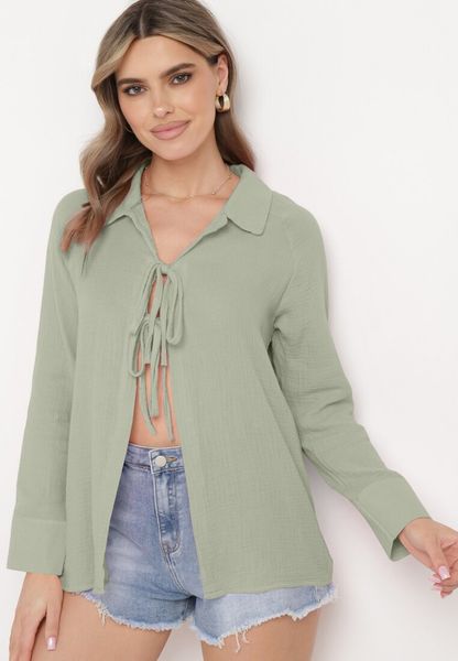 Zielona Bawełniana Bluzka z Kołnierzykiem i Wiązaniem z Przodu Abilla