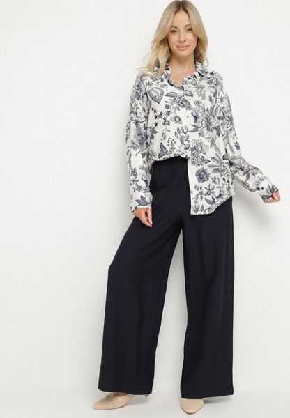 Granatowy Komplet Wiskozowy z Koszulą w Kwiaty i Szerokimi Spodniami Hanalore