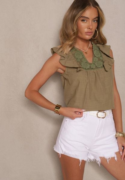 Zielona Bluzka z Bawełny z Lnem Falbankami i Haftem Ziarinda