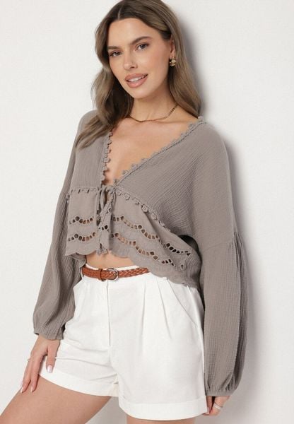 Brązowa Bawełniana Bluzka z Ażurowymi Zdobieniami i Wiązaniem Galondra