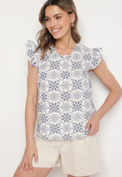Niebiesko-Beżowa Bluzka z Lnu i Wiskozy z Falbanką przy Rękawach Zirenna