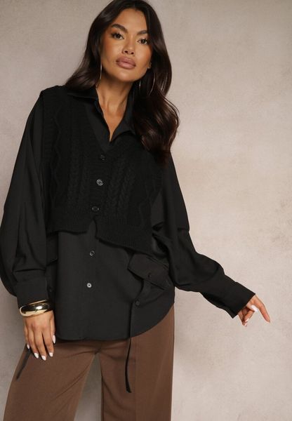 Czarna Koszula o Nietoperzowym Kroju z Naszytą Dzianinową Kamizelką Hanorielin
