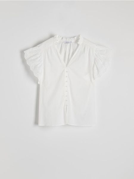 Biała Bawełniana Koszula z Falbanką przy Szyi Ozdobiona Haftami i Ażurową Taśmą Rionna