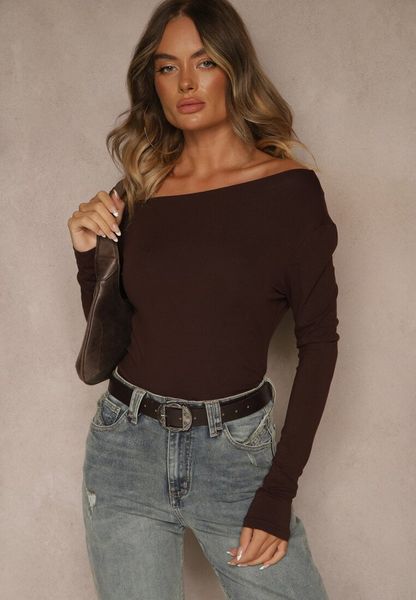 Brązowa Bluzka Longsleeve o Asymetrycznym Kroju z Poduszkami w Ramionach Tusandia