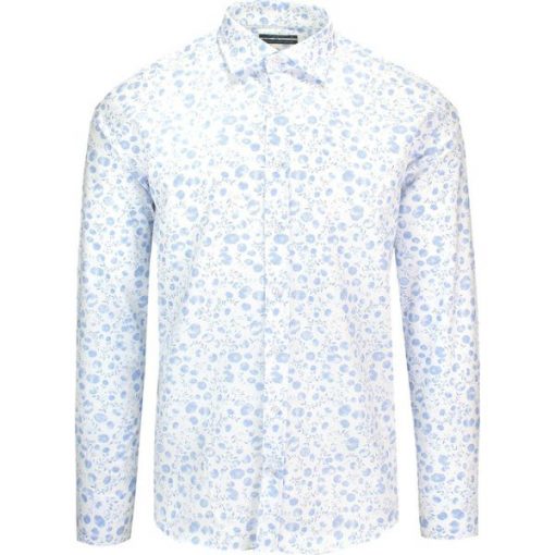 Koszula, Biała w Niebieskie Kwiatki, Bawełniana, Taliowana, Długi Rękaw -QUICKSIDE