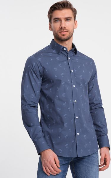 Ombre Klasyczna męska bawełniana koszula SLIM FIT w palmy – ciemnoniebieska V5 OM-SHCS-0156 S