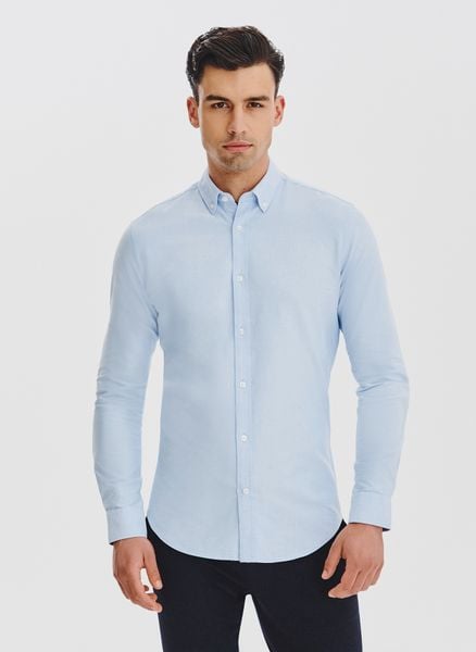 Niebieska koszula męska – Pako Lorente. Koszula z długim rękawem. Gładka koszula męska. Skład: 100% bawełna. Fason: Slim. Koszula z kołnierzykiem button-down.