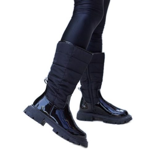 Czarne Kozaki Bikery Lakierowane na Szpilce Ozdobione Klamrami i Wywiniętą Cholewką Cretira
