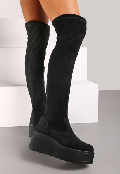 Czarne Kozaki na Koturnie i Platformie z Dopasowaną Cholewką Eriveti