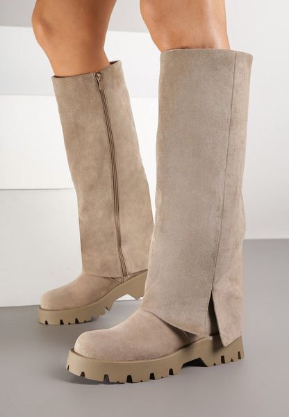 Ciemnobeżowe Kozaki na Podeszwie z Tłoczeniami z Wywiniętą Cholewką Avettrie