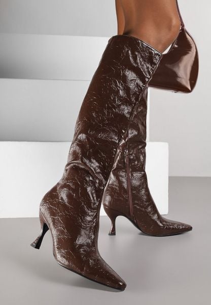 Brązowe Kozaki na Szpilce Vices z Marszczoną Cholewką z Efektem Spękań Tidvire