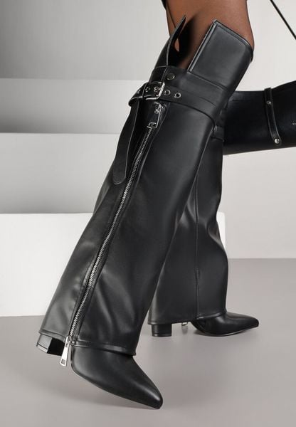 Czarne Kozaki Typu Kowbojki na Obcasie z Wywiniętą Cholewką i Suwakiem Fiovra