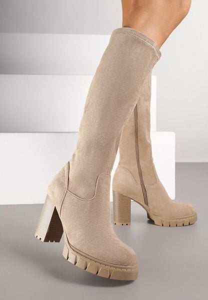Ciemnobeżowe Kozaki z Imitacji Zamszu na Słupkowym Obcasie Falirelle