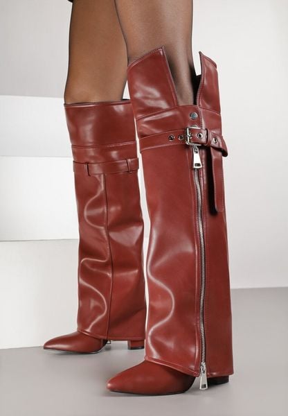 Bordowe Kozaki na Stożkowym Obcasie z Wywiniętą Cholewką Klamrami i Suwakiem Ernenta