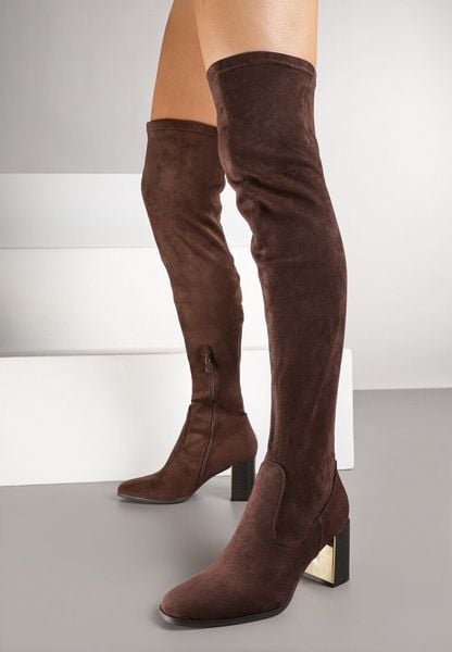 Brązowe Długie Kozaki za Kolano z Imitacji Zamszu na Metalicznym Obcasie Terephne