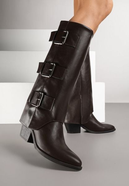 Brązowe Kozaki na Słupku Ozdobione Klamrą i Wywiniętą Cholewką z Tłoczeniem Latelia