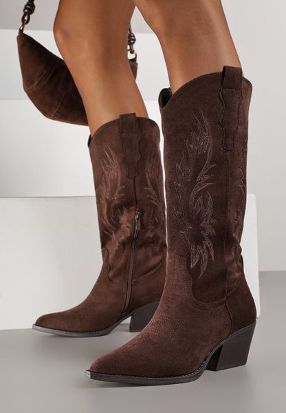Brązowe Kozaki Kowbojki na Stożkowym Obcasie z Haftowaną Cholewką Nallissea