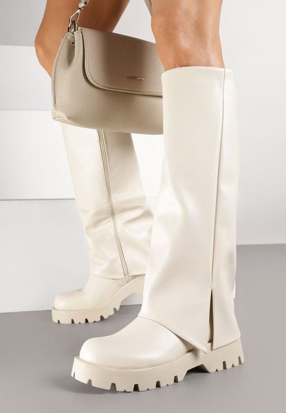 Beżowe Kozaki na Podeszwie ze Żłobieniami z Cholewką Imitującą Nogawkę Rilarresa