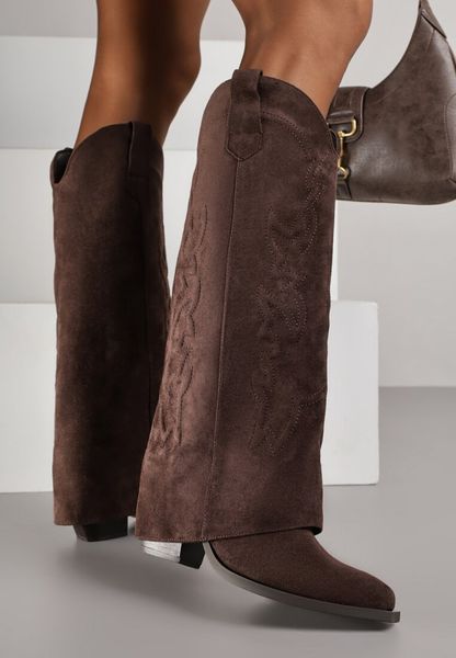 Brązowe Kozaki Kowbojki na Stożkowym Obcasie z Wywiniętą Cholewką z Haftem Fenassa