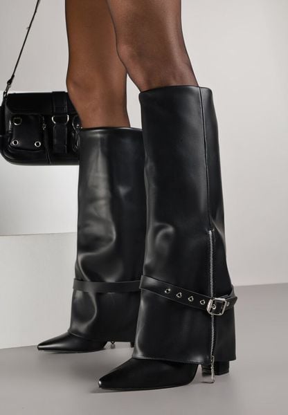 Czarne Wysokie Kozaki na Słupku z Wywiniętą Cholewką i Paskiem z Klamerką Zaffela