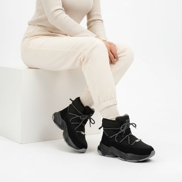 Śniegowce damskie Big Star, z połączenia materiału tekstylnego i syntetycznego z wysoką cholewką sznurowaniem z elastycznymi linkami, czarne, KK27427