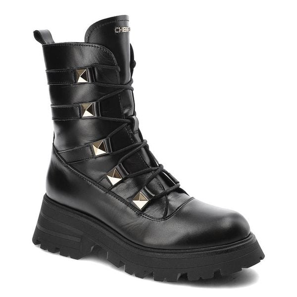 Botki damskie CheBello, ze skóry naturalnej licowej z wysoką sznurowaną cholewkąmasywną podeszwą z wyraźnym bieżnikiem, czarne, 2965-401-MIC-S202