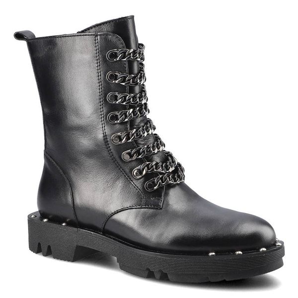 Botki damskie Carinii, naturalna skóra licowa z ozdobnym sznurowaniem na metalowych łańcuchach oraz masywną podeszwą, czarne, B7614-E50