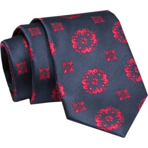 Elegancki, Klasyczny, Męski Krawat -ALTIES – Granat z Czerwonym Motywem Kwiatowym