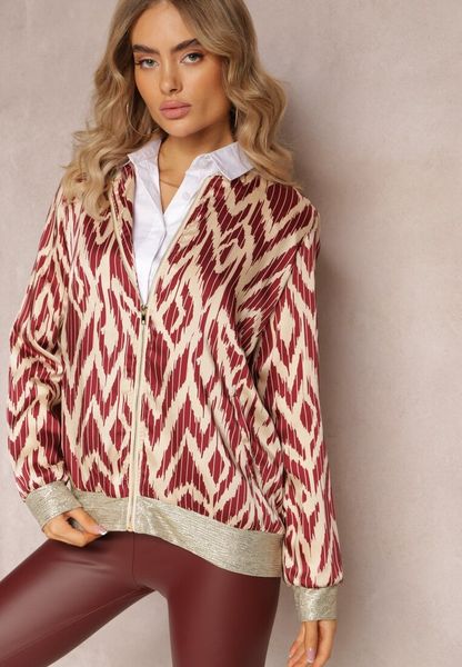 Bluza Niatas o kroju bomberki, zasuwana z przodu na zamek błyskawiczny. Wykonana z tkaniny w fantazyjny wzór z metaliczną nitką. Wsuwane kieszenie na wysokości pasa.