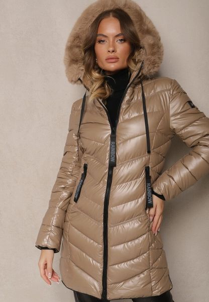 Ciemnobeżowa Pikowana Kurtka z Kapturem Zdobionym Odpinanym Futerkiem Tinetisa