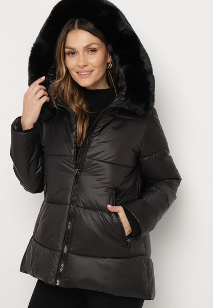 Czarna Pikowana Kurtka z Szerokimi Ściągaczami i Ozdobnym Futrem przy Kapturze Inandria