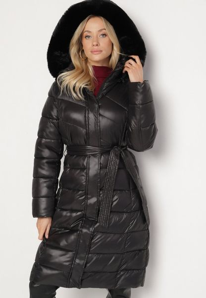 Czarna Pikowana Kurtka o Długim Kroju z Odpinanym Kapturem z Futerkiem i Paskiem oleti