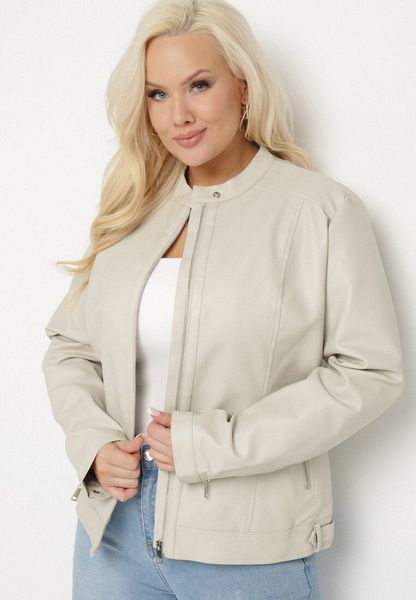 Jasnobeżowa Kurtka Ramoneska Bez Kołnierzyka z Suwakami na Rękawach Rilinne