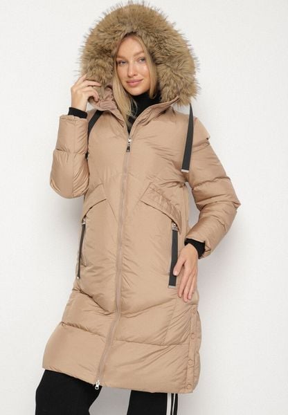 Ciemnobeżowa Pikowana Kurtka z Kapturem z Futrem i Ozdobnymi Taśmami Lendria