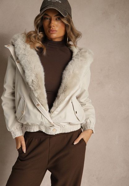 Jasnobeżowa Kurtka o Kroju Bomberki z Kapturem i Futerkiem Rafenea