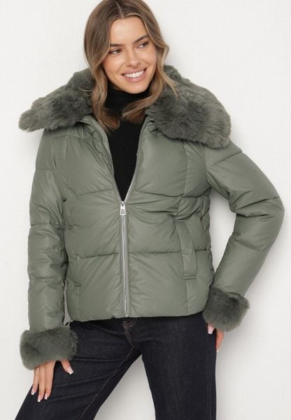 Zielona Pikowana Kurtka z Szerokim Kołnierzem z Futerkiem Galerra