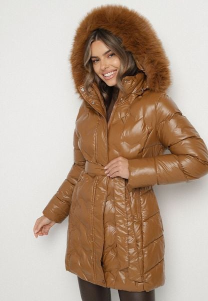 Brązowa Pikowana Kurtka z Odpinanym Kapturem i Futerkiem Wiązana Paskiem Olenessa
