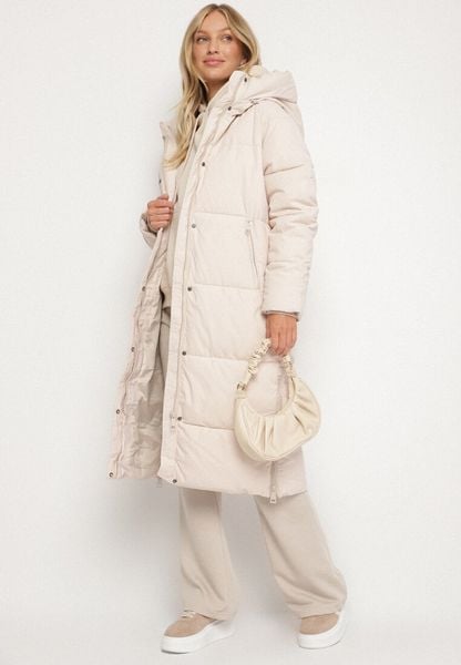 Jasnobeżowa Pikowana Kurtka Zimowa z Kapturem i Bocznymi Suwakami Acurrive
