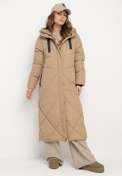 Ciemnobeżowa Pikowana Kurtka o Długim Pudełkowym Kroju z Kapturem i Kieszeniami Attesina