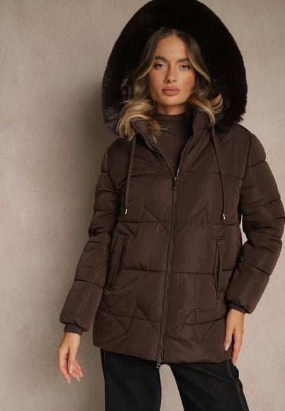 Brązowa Taliowana Kurtka z Pikowanymi Przeszyciami i Kapturem z Futrem Avileria