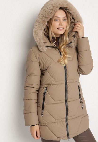 Brązowa Taliowana Kurtka z Pikowanymi Przeszyciami i Kapturem z Futrem Mundria