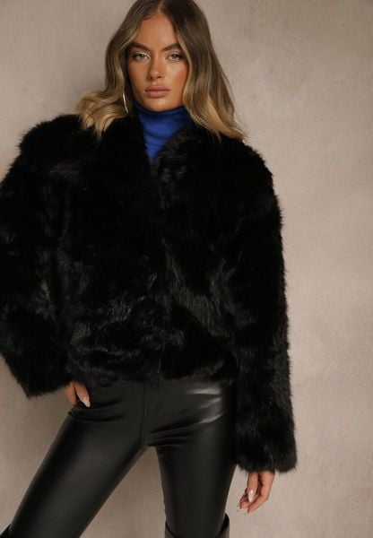 Czarna Futerkowa Kurtka Dwurzędowa z Szerokim Kołnierzem Fesandrea